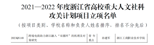 日前,浙江省教育厅办公室发文公布了2021—2022年度浙江省高校重大人文社科攻关计划项目,跨境电商专业喜获立项青年重点项目课题。
