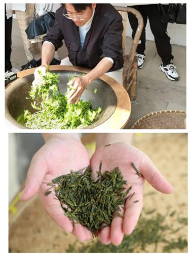 摊青后开始炒茶,炒茶又叫杀青,是通过高温破坏和钝化鲜茶叶中的氧化酶活性,抑制鲜叶中的茶多酚等的酶促氧化,蒸发鲜叶部分水分,使茶叶变软,便于揉捻成形,同时散发青臭味,促进良好香气的形成的一种制茶步骤。炒茶师傅将炒茶锅烧至200°后,将同学们刚采的新鲜的一叶一芽倒入锅中,用双手将整个茶叶先压在锅中在向上捧起再将茶叶均匀抖落。整个炒制过程持续了一个多小时,随着炒制过程散发的淡淡青草香慢慢变成诱人的茶香,清香的茶叶就制成了。