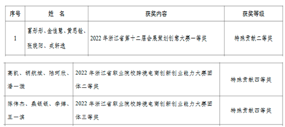 近日,跨境电商专业富彤彤在2022年浙江省第十二届会展策划创意大赛中获得一等奖一项,高凯、胡航斌、陆珂欣、潘一漩、陈伟杰、桑银银、李婵、王一滨,在2022年浙江省职业院校跨境电商创新创业能力大赛中获得团体二等奖和三等奖各一项,均获得学校特殊贡献奖学金。