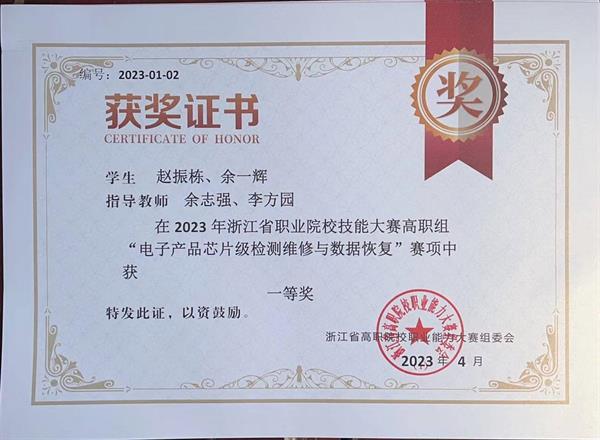 日前,2023年浙江省职业院校技能大赛高职组电子产品芯片级检测维修与数据恢复赛项于浙江商业职业技术学院圆满结束,全省25支参赛队选手各显身手,同台竞技,为青春挥下浓重的一笔。我校电子信息学院自动化专业2122班赵振栋、余一辉同学表现出色,配合默契,获得省一等奖第二名的优异成绩。