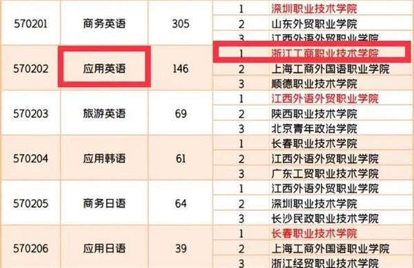 本校应用英语专业为省级特色专业、校优势专业、重点专业,2001年正式招生。招生分数线近三年来为本科线以上。专业共有专任教师18名,双师比100%,2名正高、5名副高,1名博士,5名拥有上海高级口译证书,5名拥有人事部二级口笔译证书。专业开展“一体两翼进阶式模块化”课程体系,分设“外贸英语”和“英语教育”方向。近10年来,专业指导学生获浙江省口语A类比赛30多个奖项,其中12个冠军,10名学生代表浙江省参加国赛,获得国赛一等奖3项,二等奖5项。