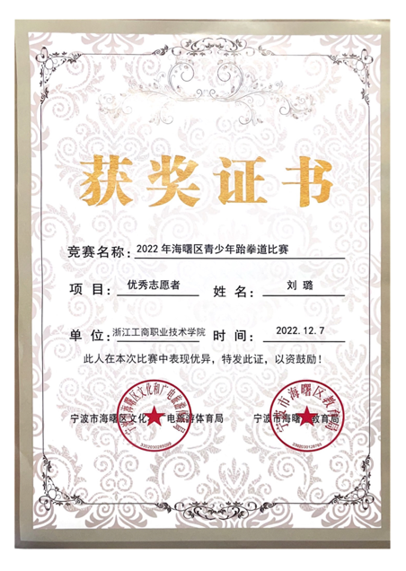 该同学还积极参与学校学生工作,先后担任校学生会宣传部干事,校学生会宣传部负责人,组织参与2023年度市委农村工作会议暨“大美宁波”建设现场会、海曙区青少年跆拳道比赛、全国研究生考试、海曙区农业农村高质量发展大会、2022年迎新晚会、十佳歌手等校内外活动。
