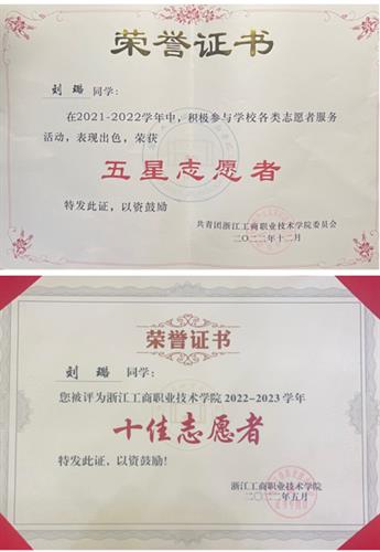 该同学先后获得普通话二级乙等、宁波市外贸单证员岗位专业证书,浙江省政府奖学金,校级三等奖学金,校级优秀团员,校十佳志愿者,校五星志愿者,2023年“挑战杯”大学生创业计划竞赛校级二等奖,2022年“挑战杯”大学生创业计划竞赛校级三等奖,“平安校园”征文校级二等奖,“推广普通话”校级征文三等奖,数字商务学院“我为家乡代言”主题活动一等奖。