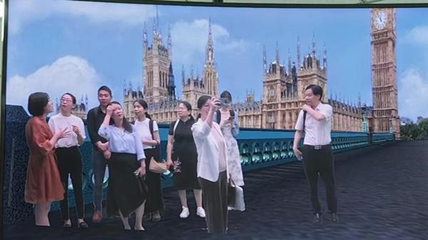 考察交流过程中,老师们在徐娉娉科长的介绍下,参观了各国语言文化体验中心、各类商务场景、旅游场景仿真实训室,近距离体验虚拟仿真教学等,并在VR情境实训室进行了现场体验和研讨。