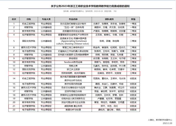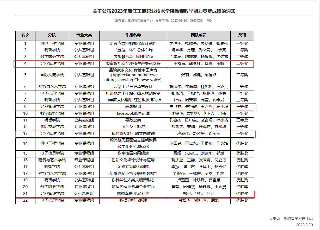 根据学校《关于开展2023年浙江工商职业技术学院教师教学能力竞赛的通知》,分院以提高教师的师德践行能力、专业教学能力、综合育人能力和自主发展能力,通过竞赛促进教师综合素质全面提升为目的,在专任教师只有31位(其中近两年共有7位教师要退休)师资匮乏的情况下,积极动员、团结一致,成功组建了四个队伍共14位老师报名参加,经过攻坚克难,在2023年校教师教学能力竞赛取得了非常不错的成绩(图1、图2和图3),实现了分院突破第一、成绩第二,凝心聚力的目的。