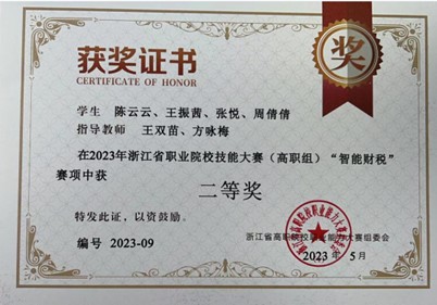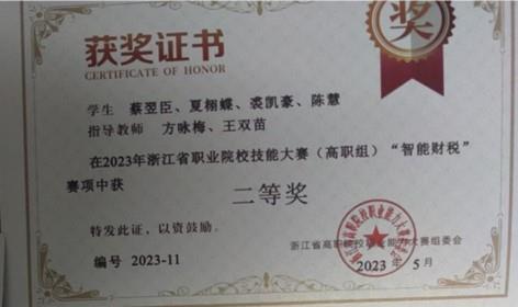 备赛期间,学校和院系领导给予了高度重视和人力支持。我校由方咏梅老师、王双苗老师带队指导的两支学生队伍在比赛中脱颖而出,最终两个团队均取得浙江省二等奖的成绩。参赛队员克服种种挑战,凭借扎实的理论基础和过硬的实践能力,圆满完成比赛任务,充分展示了智能财税专业技能和实践能力。