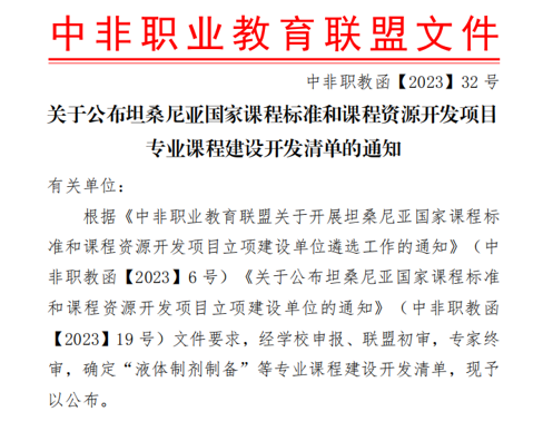 2023年9月1日,中非职业教育联盟发布了《关于公布坦桑尼亚国家课程标准和课程资源开发项目专业课程建设开发清单的通知》,我校榜上有名。该项目针对坦桑尼亚国家重点专业领域,开发专业课程标准,优选中国优质专业课程资源,经本土化修订,坦桑尼亚国家职业教育委员会审核后,注册认定为坦桑尼亚国家职业教育课程标准及教学资源,纳入国家职业教育体系和国家数字化教学资源平台,指导和助力坦桑尼亚国家职业院校开展人才培养工作,引领坦桑尼亚教育教学数字化变革,推动优质教育教学资源在坦普及普惠,提升国家人才培养整体水平。