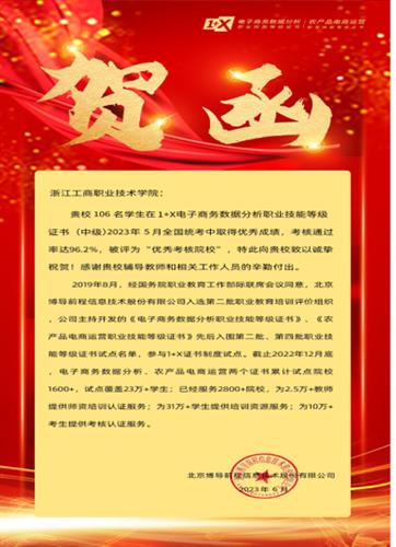 6月底,电子商务数据分析职业技能等级证书考试结果出炉,考核通过率为96.2%,我校被评为“优秀考核院校”。为此,北京博导前程信息技术股份有限公司专门向我校发送贺信,恭喜同学们在2023年5月1+X电子商务数据分析职业技能等级证书全国统考中取得优异成绩,感谢老师们的辛苦付出,希望能够继续携手共育英才。