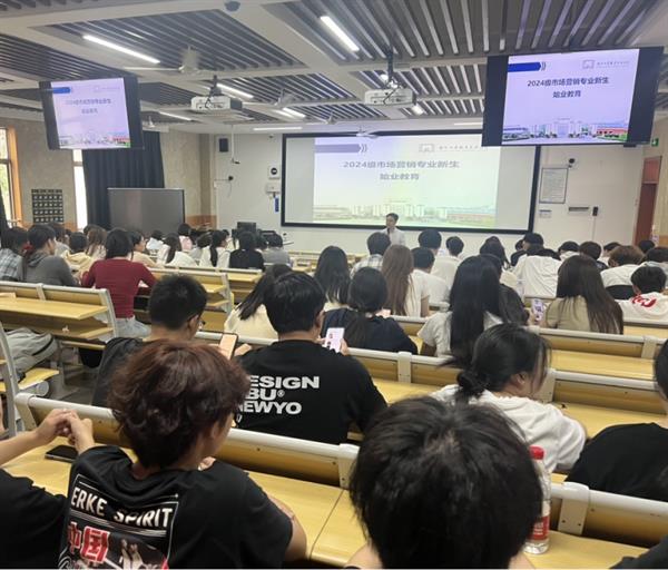赵主任针对当前就业市场的形势进行了分析。他指出,在商科走弱、工科走强的背景下,市场营销专业的毕业生主要就业于市场类、销售类和客服类岗位,特别是客服和主播类售前售后岗位需求旺盛。赵主任建议学生提前规划职业发展路径,树立正确的就业观念。他通过分享三位优秀毕业生的事迹——07级吴海丽考取公务员、11级赵炎艳创办的企业年销售额达一亿元、15级张阿妃成为阿里巴巴高级体验专员——激励新生们努力学习,追求卓越。