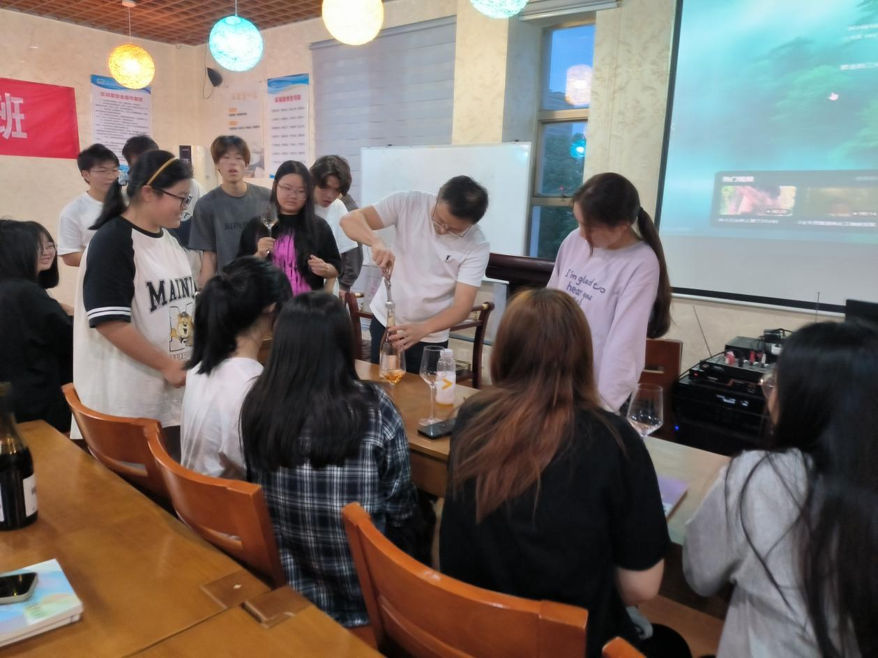 在现场侍酒与精品葡萄酒品鉴的实践环节,同学们在老师们的指导下,亲自品尝了来自罗纳河谷的优质葡萄酒,通过直观的感官体验,深入感受了不同品种葡萄酒的独特风味和香气。这一环节不仅让同学们在实践中巩固了理论知识,更激发了他们对葡萄酒文化的浓厚兴趣。