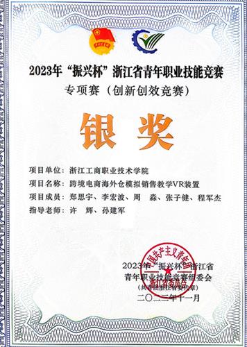 近日,2023年“振兴杯”浙江省青年职业技能竞赛落下帷幕,我校推送项目“跨境电商海外仓模拟销售教学VR装置”(指导教师许辉、孙建军)从众多优秀作品中脱颖而出,收获银奖,创学校参赛以来历史最好成绩。