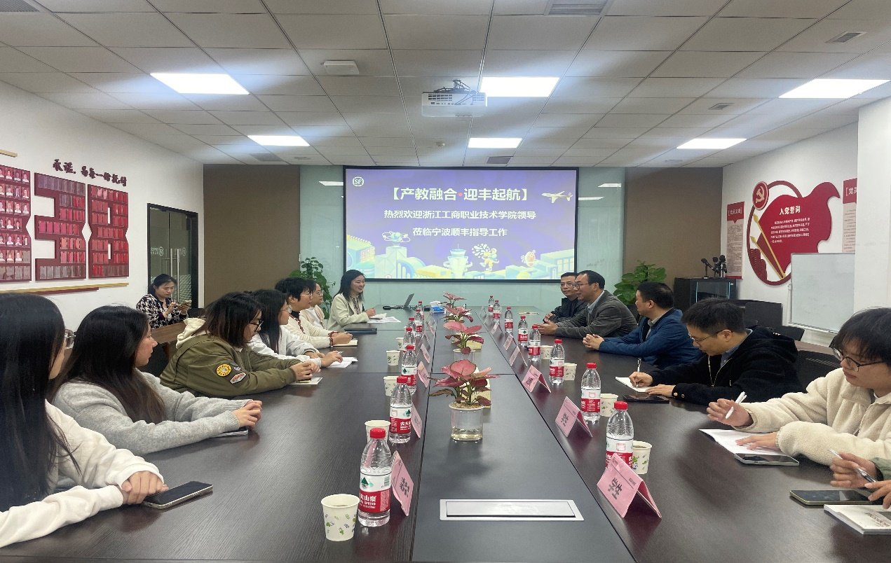 最后一站,一行人前往宁波顺丰总部进行走访。在顺丰,校方再次与企业负责人及学生代表进行了座谈。座谈会上,楼晓东副校长强调了学徒制的重要性,指出这种模式不仅为学生提供了宝贵的实践机会,也为企业培养了潜在的人才。顺丰的企业负责人反馈,我校学生在顺丰的各个不同的岗位表现都很出色,积极主动,能快速融入企业文化,对学校的前期培养和后期人才输送表示感谢。