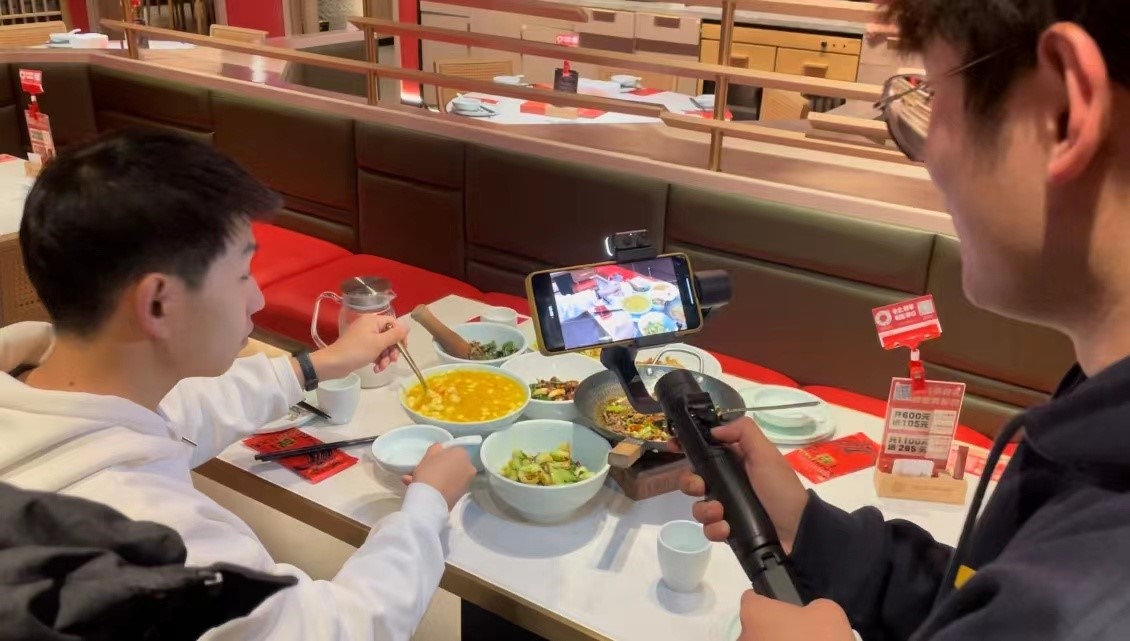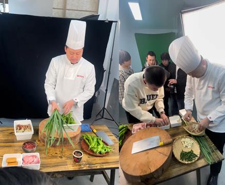 当“现烹鱼头王”、“超级辣椒炒肉”、“鲜椒铁锅鸡”、“蟹黄豆腐羹”、“香蒜炒腊肉”等12道热气腾腾的菜品陆陆续续摆在电子商务专业同学们面前时,他们并没有甩开筷子胡吃海喝,只见同学们分成2-3人一组,训练有素地对菜品进行补光拍摄;有的同学打开了手机稳定器进行推拉摇移的VLOG运镜;另外几组同学在老师的辅助下,把店内的直播间棚拍设备调试好,准备拍一段湘间田舍行政主厨陈国盛大师进行烧菜。