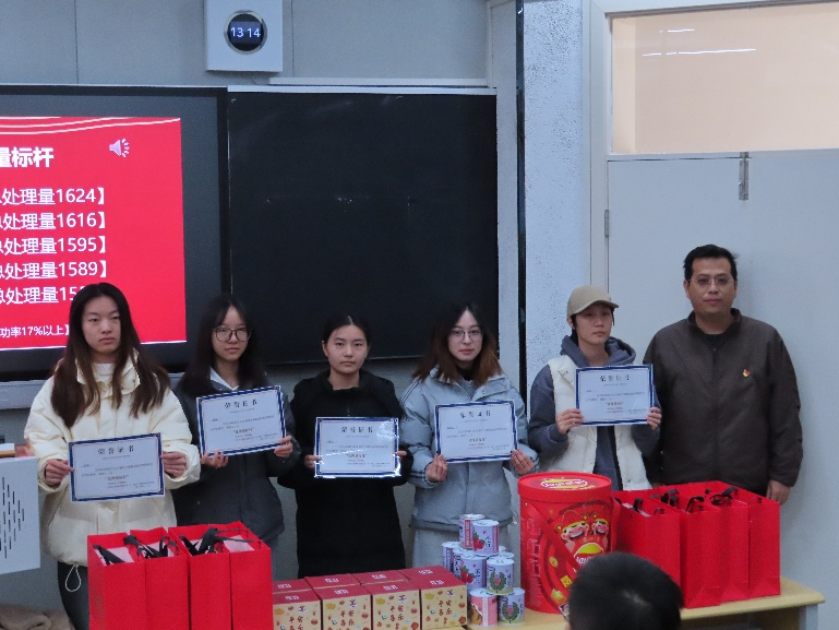 接下来的表彰与奖励环节,不仅表彰了11月、12月“处理量标杆”、“预约成功率标杆”等各项在本次实践项目中表现突出的学生,更是提供了“人才直通车”鼓励优秀工商学子的优异表现,荣誉证书和奖品在同学们的手中熠熠生辉。