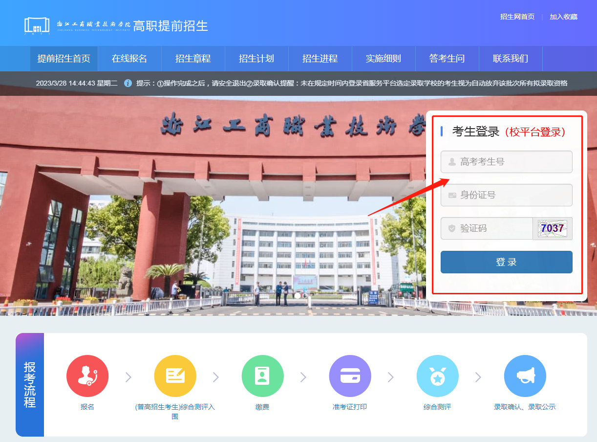 1、在考生登录(校平台登录)处输入高考考生号(2433开头的14位数字,可在浙江省高校招生考试信息管理系统中查询)、身份证号登录