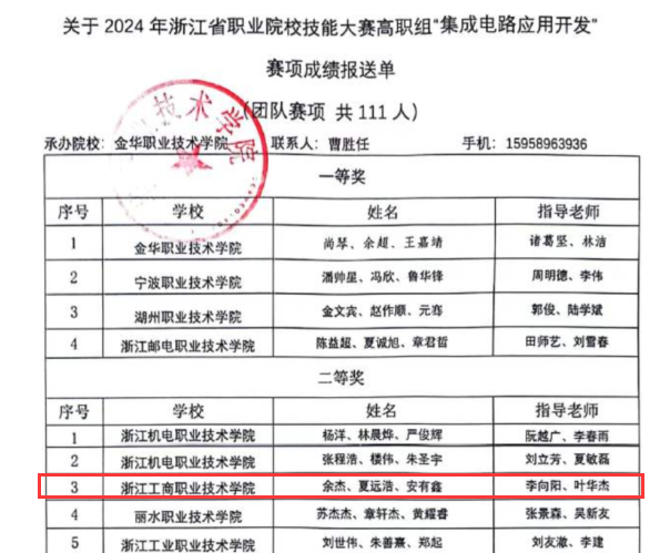 2024年浙江省职业院校技能大赛(高职)集成电路应用开发”赛项于324日在金华职业技术学院举,共有来自全省19所院校共有37支队参赛。我校应用电子技术专业学生余杰、夏远浩、安有鑫团队荣获等奖。