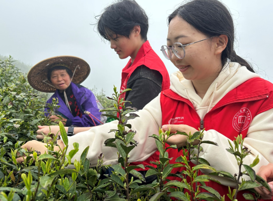 茶树排列整齐,犹如一幅巨大的绿色画卷。茶农们身着朴素的衣物,头戴斗笠,手持竹篮,踏着露水穿梭其中,灵巧的手指在茶叶上轻轻一掐,一片片嫩绿的茶叶便落入篮子里,同行学生也踊跃加入到采茶队伍中。