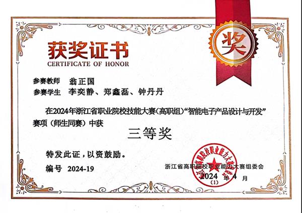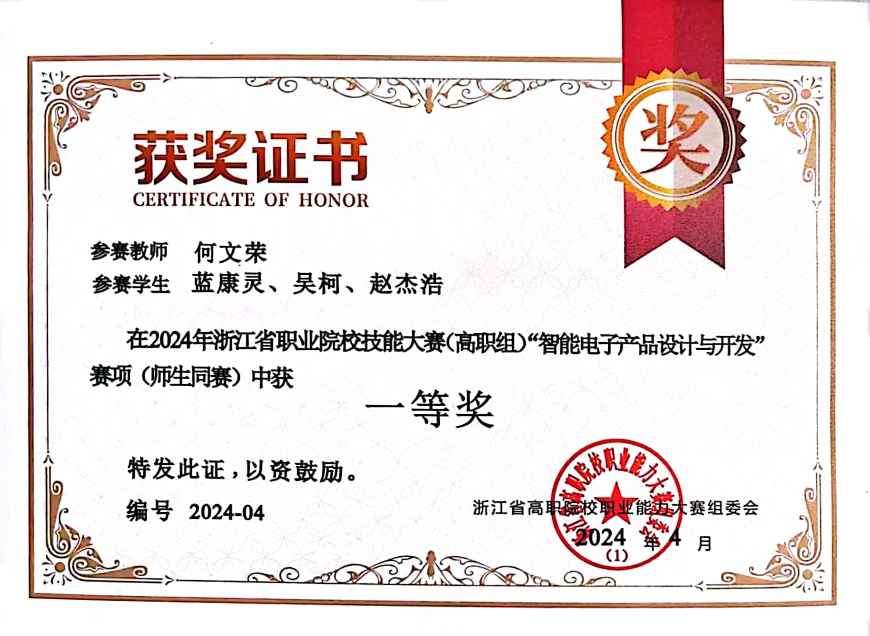 2024年浙江省职业院校技能大赛(高职组)“智能电子产品设计与开发”赛项于3月30日在宁波职业技术学院举行,共有来自全省多所院校共有42支队120人参赛。应用电子技术专业师生荣获一等奖1项、三等奖1项。截至今年,该赛项已经连续4年荣获一等奖。