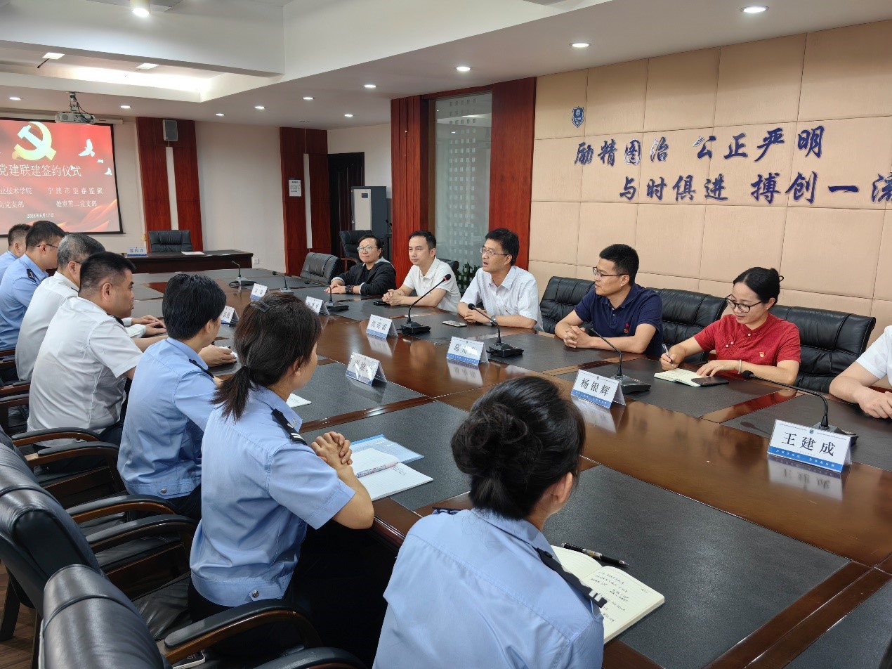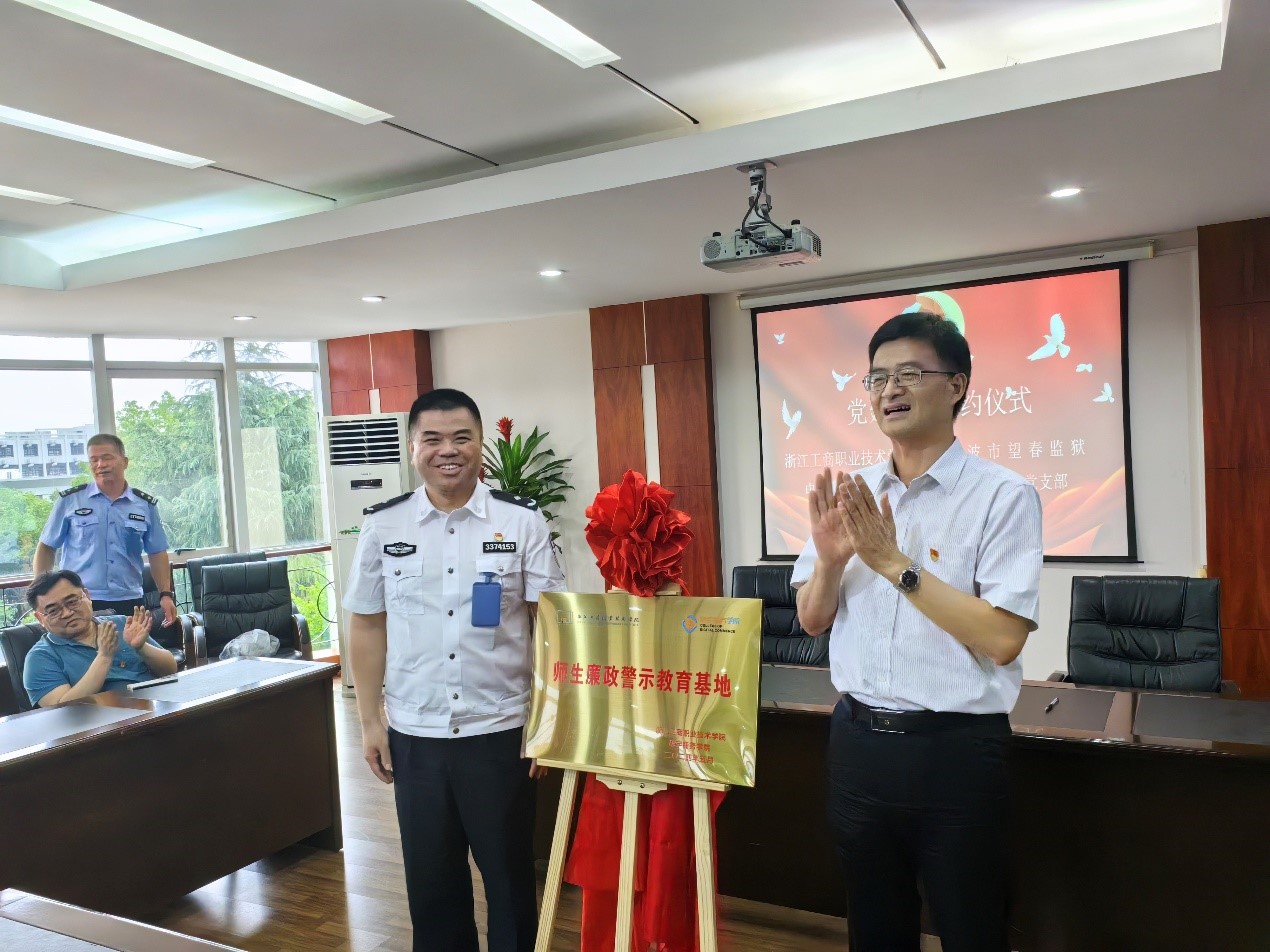 活动中,宁波市望春监狱处室第二支部曹威书记介绍了监狱的基本情况,以及在服刑人员管教上对“枫桥经验”的借鉴与应用等。浙江工商职业技术学院数字商务学院党总支书记沈弥雷简要介绍了学校的发展历程与学院特色,强调学校与监狱在教育与促进就业方面存在共同之处。随后,双方党支部书记签署了“党建联建协议书”,并举行了挂牌仪式,正式建立“数商学院师生廉政警示教育基地”。