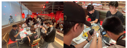 活动当天,学生们分组对“湘间田舍”的菜品进行了详细的拍摄,并采访了店内的行政主厨陈国盛。他们使用专业的摄影设备和技巧,捕捉每一道菜品的独特魅力,同时记录下厨师精湛的烹饪技艺。此外,学生们还利用手机稳定器拍摄了一系列生动的VLOG,真实展现了餐厅的日常运营和美食制作过程。