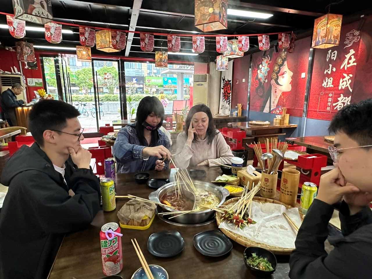 在对中国文化充满好奇的Michele面前,志愿者们带领外教体验了四川火锅和不同的菜品,满足了外教对于东方大国的期望与幻想,同时也激发起了外教对我们扫码快速点单与支付的热情,当然,这对志愿者们可是不小的挑战,手指在不大的屏幕上勾勒出了“清明上河图”,在断续的指导中教会了外教使用的微信与支付宝,这让彼此都印象深刻。