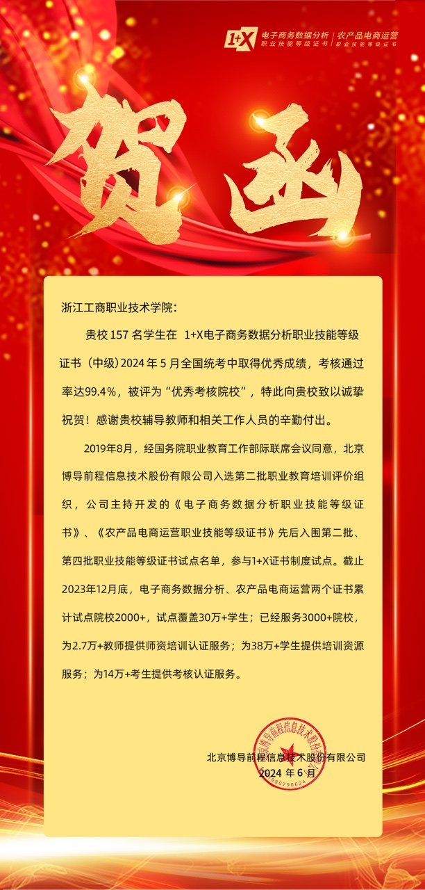 6月底,电子商务数据分析职业技能等级证书考试结果出炉,考核通过率为99.4%,我校被评为“优秀考核院校”。为此,北京博导前程信息技术股份有限公司专门向我校发送贺信,恭喜同学们在2024年6月1+X电子商务数据分析职业技能等级证书全国统考中取得优异成绩,感谢辅导教师和相关工作人员的辛勤付出,希望能够继续携手共育英才。(李永涛 供稿)