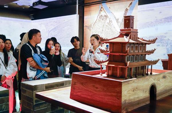 在专业教师与学生的陪同下,印尼访学团一行抵达宁波城市展览馆。展览馆作为展示宁波城市形象的重要平台,通过丰富的模型、多媒体互动和图文展示,生动呈现了宁波从古港商城到现代化国际港城的演变历程。访学团成员深入了解了宁波的城市规划、经济发展、文化遗产以及生态建设等方面的成就。