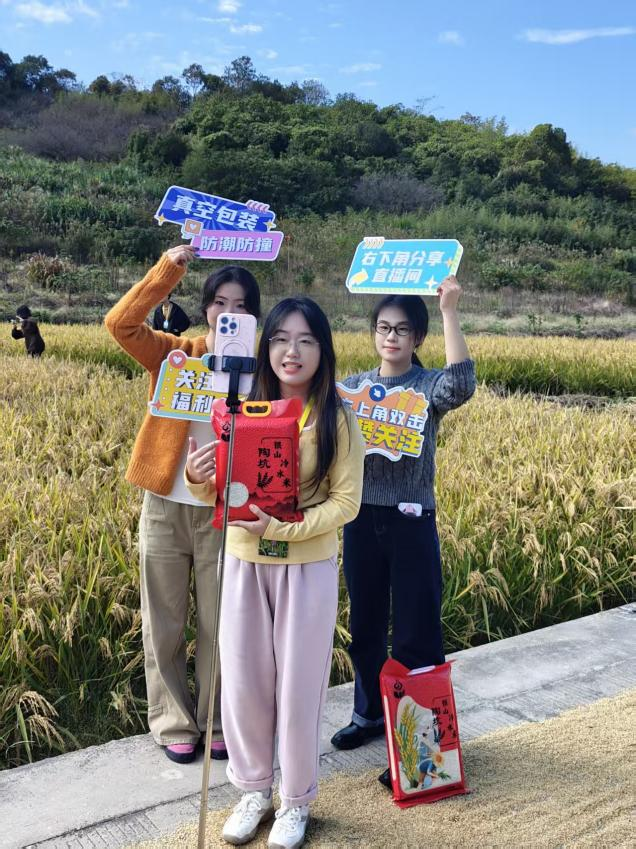 11月16日,在奉化陶坑村“稻香满田庆丰收”共富新米节现场,电子商务专业的学生们将课堂搬到田野,开展了一场生动的课外直播实践。在指导老师的带领下,学生们通过电商直播,为当地特色农产品“冷水大米”拓宽销路,以专业技能助力乡村共富。
