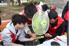 活动期间,志愿服务队针对老年居民常用的电饭煲、电暖器、收音机等小家电提供免费维修服务。现场维修组在广场上设立固定服务点,严格遵循 “登记 - 检测 - 诊断 - 维修 - 调试 - 告知” 流程,对居民送来的电饭煲、电风扇、电水壶等小家电逐一排查故障。针对线路老化、电容损坏、接触不良等常见问题,师生运用电路检测、元件焊接等专业技能开展维修;同时向老年居民普及家电保养知识、超期服役家电安全隐患及识别方法。
