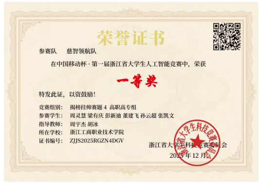 近日,第一届“中国移动杯”浙江省大学生人工智能竞赛圆满落幕。我校慈溪学院电子信息工程技术专业选派学生组成参赛团队,在指导教师的精心指导下,凭借扎实的专业基础和突出的工程实践能力,从全省众多高校队伍中脱颖而出,荣获省级一等奖,充分展示了专业建设与人才培养的阶段性成果。