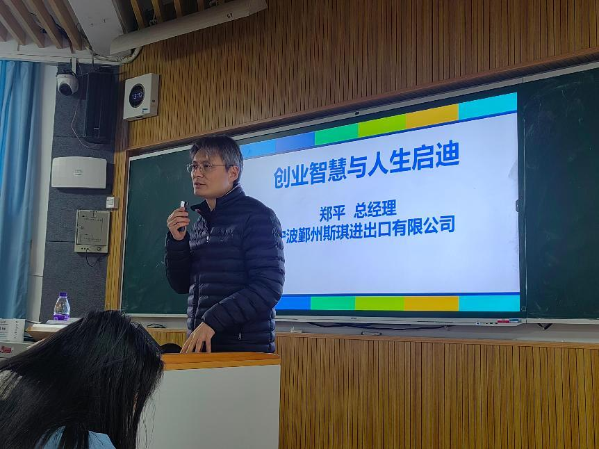 12月25日,宁波鄞州斯琪进出口有限公司总经理郑平先生受邀来到浙江工商职业技术学院,为国贸2442班和国贸2441班的同学们带来了一场主题为“创业智慧,启迪人生”的精彩讲座。