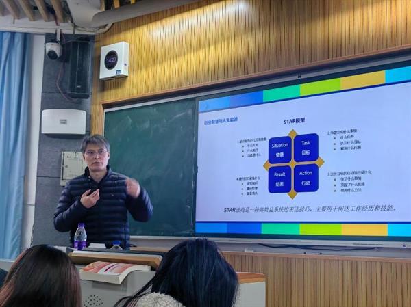 接着,郑平先生详细阐述了创业智慧的重要性。他表示,创业不仅需要有勇气和决心,更需要有智慧和策略。他向同学们介绍了“智猪博弈”的典故、SWOT分析,STAR法则的应用,鼓励同学们用思维能力梳理工作中的挑战,不断提升自己的综合素质和创业能力。