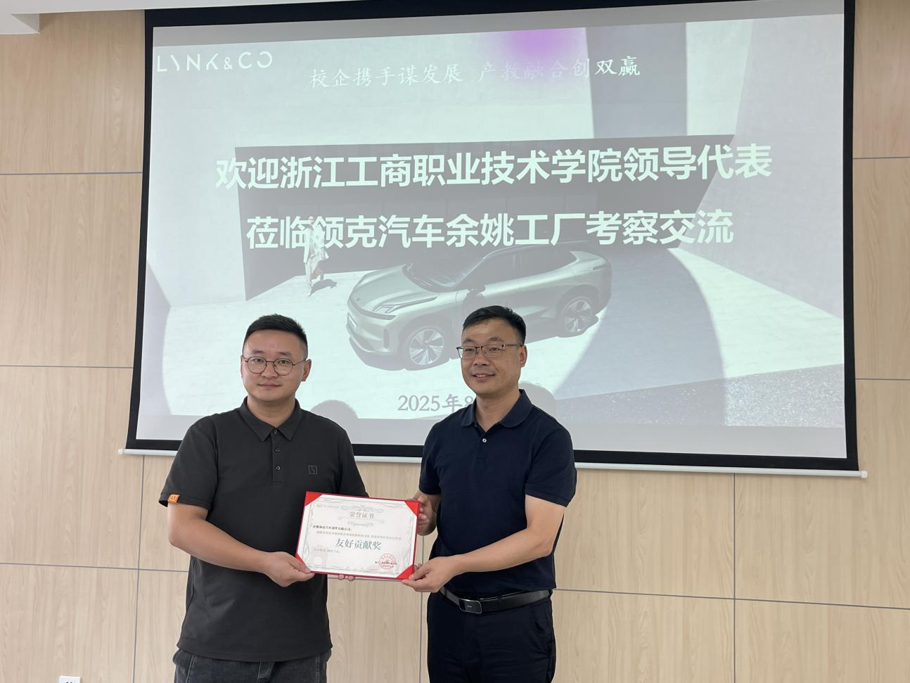 任一波在总结中首先向企业表示诚挚感谢,领克汽车长期以来在产教融合、人才培养等方面为学校提供了宝贵支持,荣获学校2024年“友好贡献奖”获奖单位。这一奖项不仅是对领克汽车积极投身产教融合、学校发展和学生成长作出贡献的高度认可,更是双方深厚合作情谊的生动见证。期望以此次访企拓岗活动为重要契机,推动校企合作向更深层次、更宽领域拓展。他表示,校企双方可以在产业学院建设方面充分释放各自优势,实现教育链、人才链与产业链的深度融合,最终构建 “产学研用”一体化的合作新格局。他也希望企业能持续关注实习和工作的学生发展状况,学校也将与企业协同为学生提供必要的支持与指导,让更多学生在优质实践平台上实现成长与价值提升。