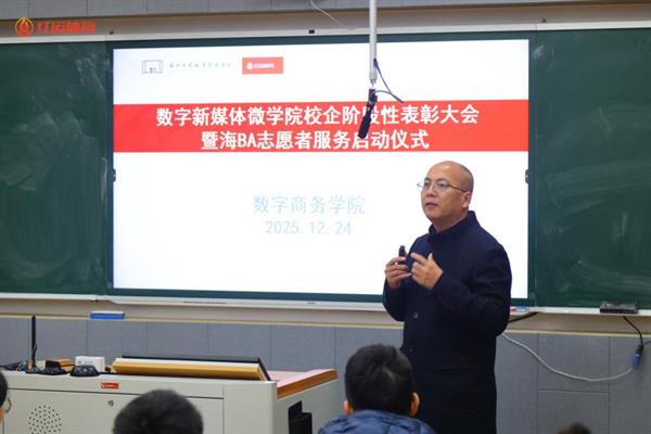 12月24日,数字新媒体微学院校企阶段性表彰大会暨海 BA 志愿者服务启动仪式在思齐楼22A7举行。宁波红运体育有限公司赛事部于总、学院李紫微副院长、电商专业部分教师及学生代表齐聚现场,共同见证这一兼具总结意义与启动价值的重要时刻。本次活动不仅为前期红运体育系列活动中表现突出的拍摄志愿者颁发荣誉,更以海BA志愿者项目启动为契机,深化校企协同育人成效,为双方高质量发展注入新活力。