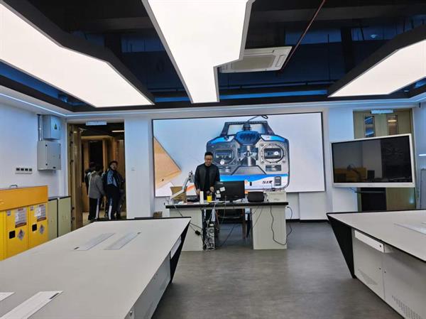 专业化设施: 位于实训室后方的升降式无人机飞行牢笼引起了大家的关注。这种设计不仅保障了室内飞行练习的安全,更通过升降调节实现了不同高度层面的飞行模拟需求,极大丰富了实训场景。
