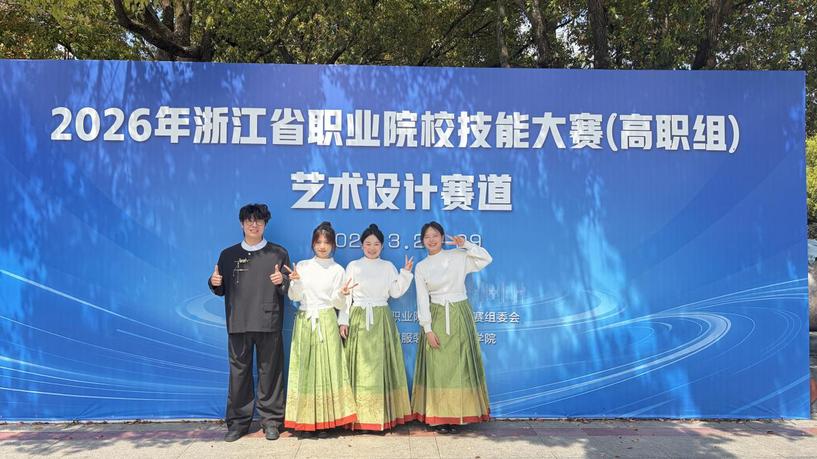 2026年3月30日,浙江省职业院校技能大赛(高职组)艺术设计赛道圆满落下帷幕。经过激烈角逐,由我校建筑与艺术学院李宇老师和邬琦姝老师指导的张冰青、濮安琪、姜楚煜、陈忆祖参赛团队,凭借扎实的专业素养与出色的创新能力,从全省近120支高职院校代表队中脱颖而出,荣获省级金奖。