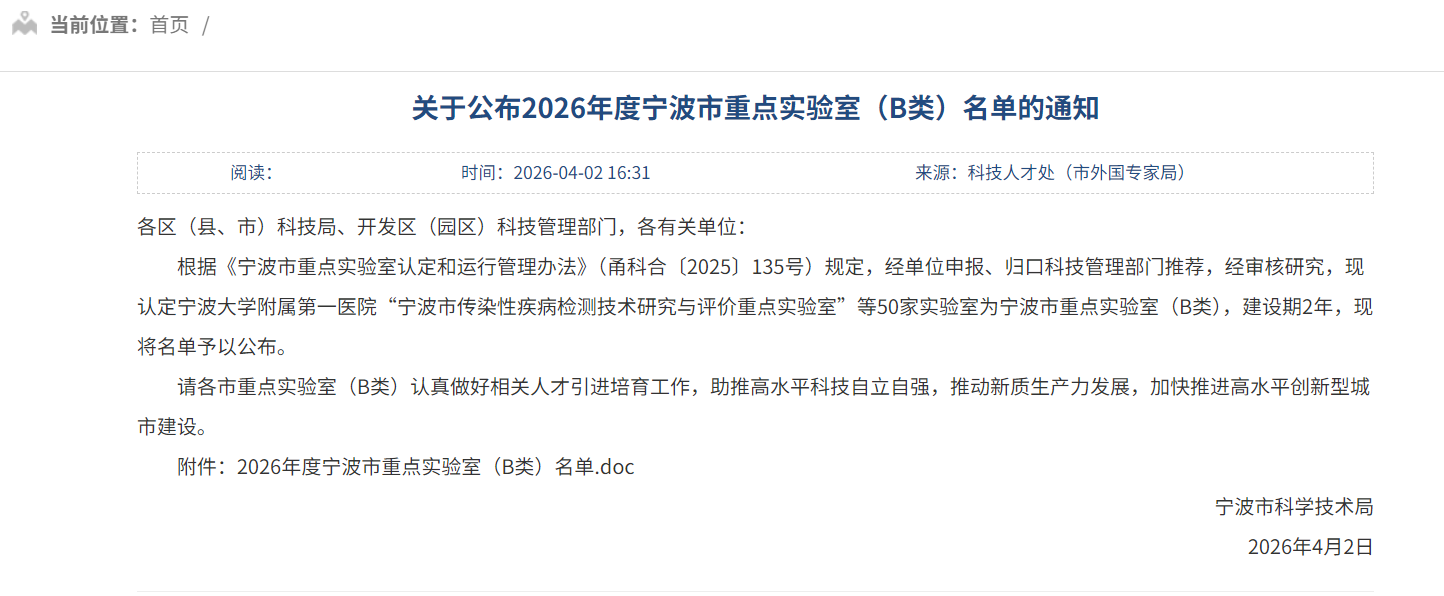 近日,宁波市科技局正式发布《关于公布2026年度宁波市重点实验室(B类)名单的通知》,学校申报的“宁波市具身智能农机与自主系统重点实验室”和“宁波市具身智能机器人关键零部件制造与检测重点实验室”双双入选。这是学校面向具身智能机器人产业推进专业建设与平台布局的重要突破。