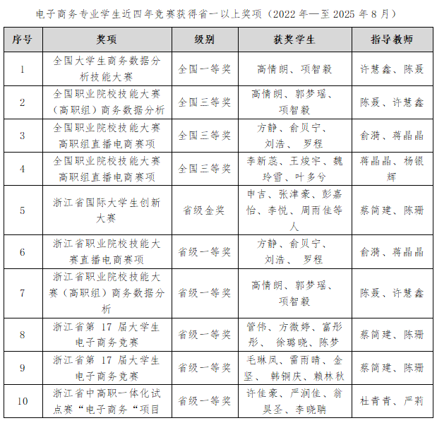 10 | 浙江省中高职一体化试点赛“电子商务“项目 | 省级一等奖 | 许佳豪、严润佳、翁昊圣、李晓聃 | 杜青青、严莉 |